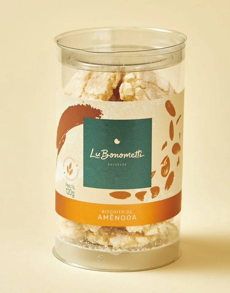 Nesta embalagem os Biscoitos vem em tamanho de biscoito para café. Tamanho perfeito para comer em uma mordida. A embalagem contem 120g gramas de biscoitinhos, cerca de 13 bolachas. Esta embalagem de Biscoito de Amêndoas é prática, mas também é chique, sendo também uma ideia de biscoito para presente.